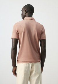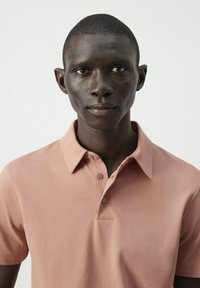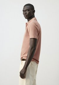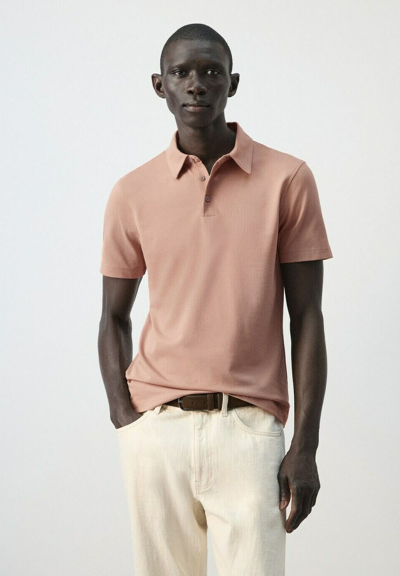 Mężczyzna w łososiowej koszulce polo, lekko wpuszczonej w jasnobeżowe spodnie z brązowym paskiem, stoi na tle jasnego, jednolitego tła.