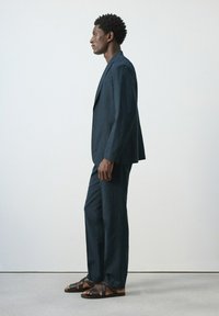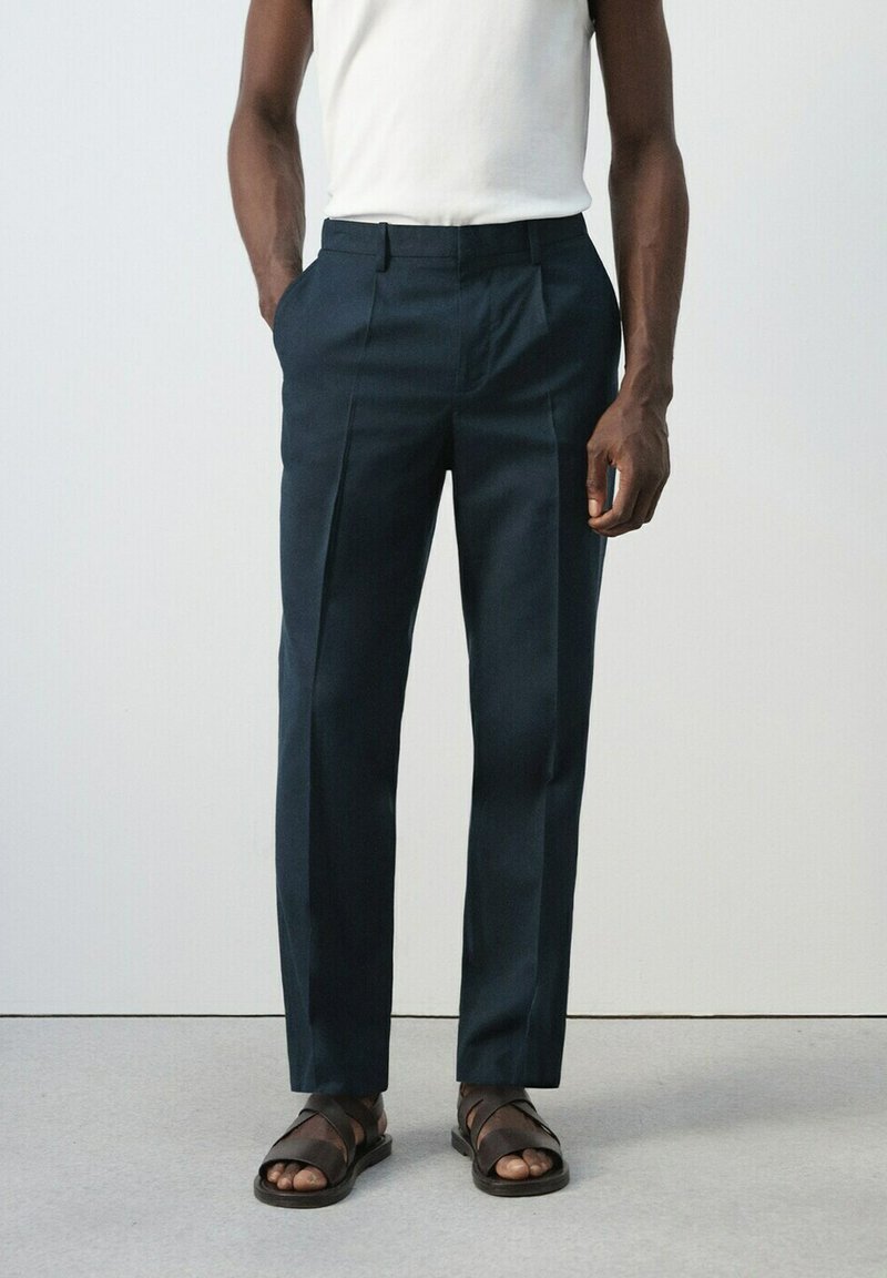 Mężczyzna ubrany w ciemne spodnie na miarę z zagięciami z przodu, biały top bez rękawów oraz brązowe skórzane sandały, stoi na jednolitym tle.