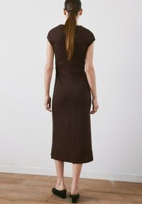 Młoda kobieta o jasnej cerze i zielonych oczach, ubrana w dopasowaną, ciemnobrązową bluzkę z krótkim rękawem na jednolitym białym tle.