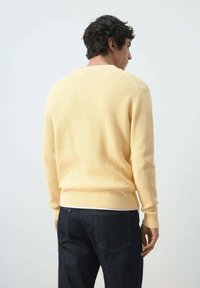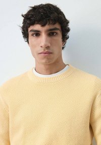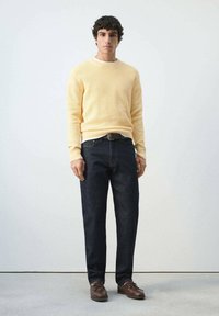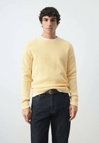 Młody mężczyzna o kręconych ciemnych włosach, ubrany w jasnżółty, dzianinowy sweter, białą koszulkę pod spodem, ciemne dżinsy i brązowy pasek na tle jednolitego tła.