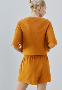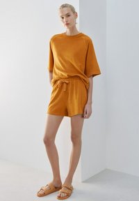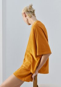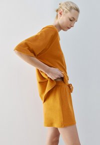 Osoba ubrana w musztardowożółte szorty z frotté z pasującą luźną bluzką, pokazującą ściągacz w talii i boczne kieszenie, stojąca z rękami opuszczonymi wzdłuż ciała.