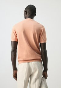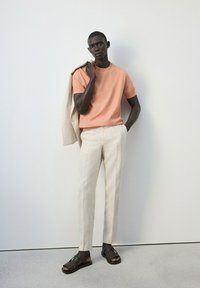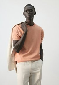 Mężczyzna w brzoskwiniowej koszuli z krótkim rękawem i jasnych spodniach, trzymający beżową kurtkę na ramieniu, stojący na tle jednolitego jasnego tła.