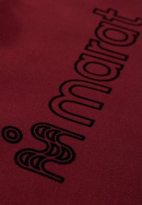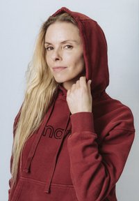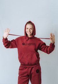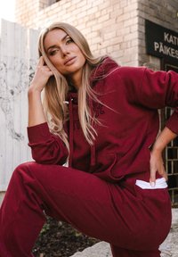 Kobieta o długich blond włosach, ubrana w bordową bluzę z kapturem i pasujące spodnie, stoi z rękami w kieszeniach na jasnym tle.