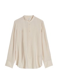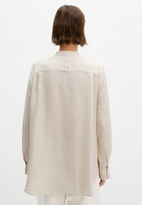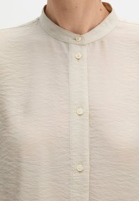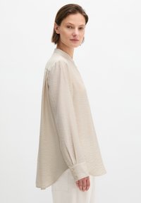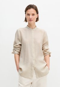 Kobieta stojąca z rękami w kieszeniach, ubrana w beżową, długorękawową koszulę na guziki oraz białe spodnie, na jednolitym tle.