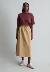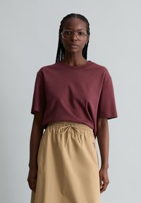 Kobieta z warkoczem i okularami, ubrana w bordową koszulkę z krótkim rękawem wsuniętą w beżową spódnicę ze sznurkiem, na jednolitym tle.