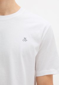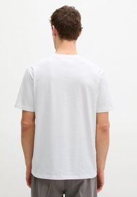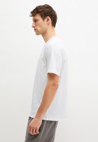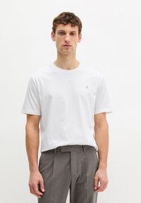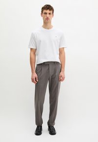 Młody mężczyzna stojący, ubrany w białą koszulkę, szare plisowane spodnie i czarne skórzane mokasyny na tle gładkiej białej ściany.