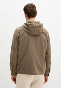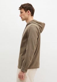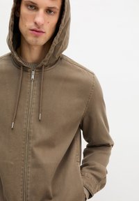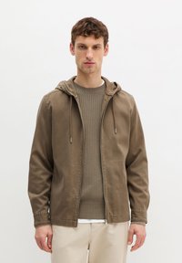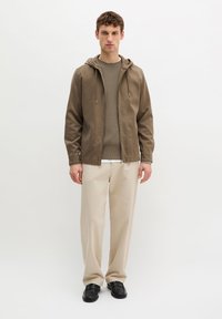 Młody mężczyzna w brązowej kurtce z kapturem zapinanej na zamek, nałożonej na prążkowany sweter i beżowe spodnie, stoi na tle jednolitego białego tła.