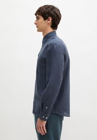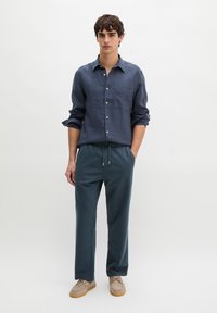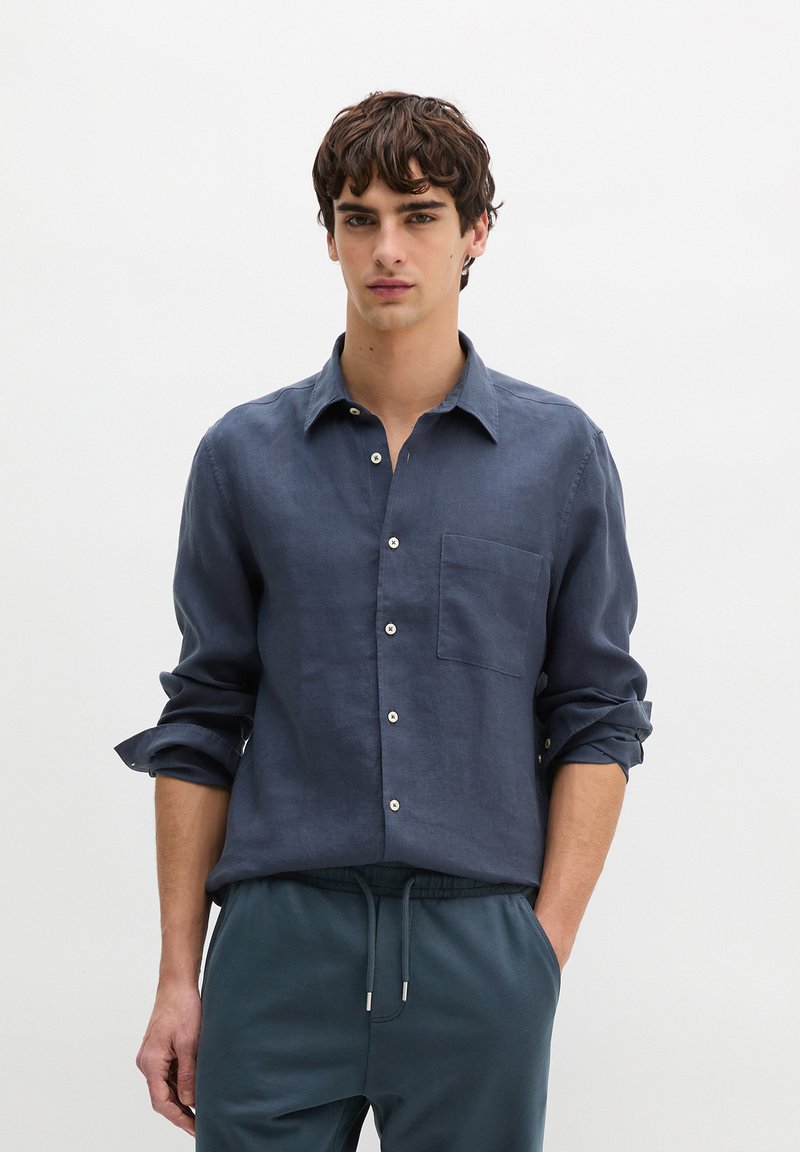 Młody mężczyzna ubrany w ciemnoniebieską koszulę zapinaną na guziki z podwiniętymi rękawami oraz pasujące spodnie ze sznurkiem, stojący na tle jednolitego białego tła.