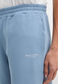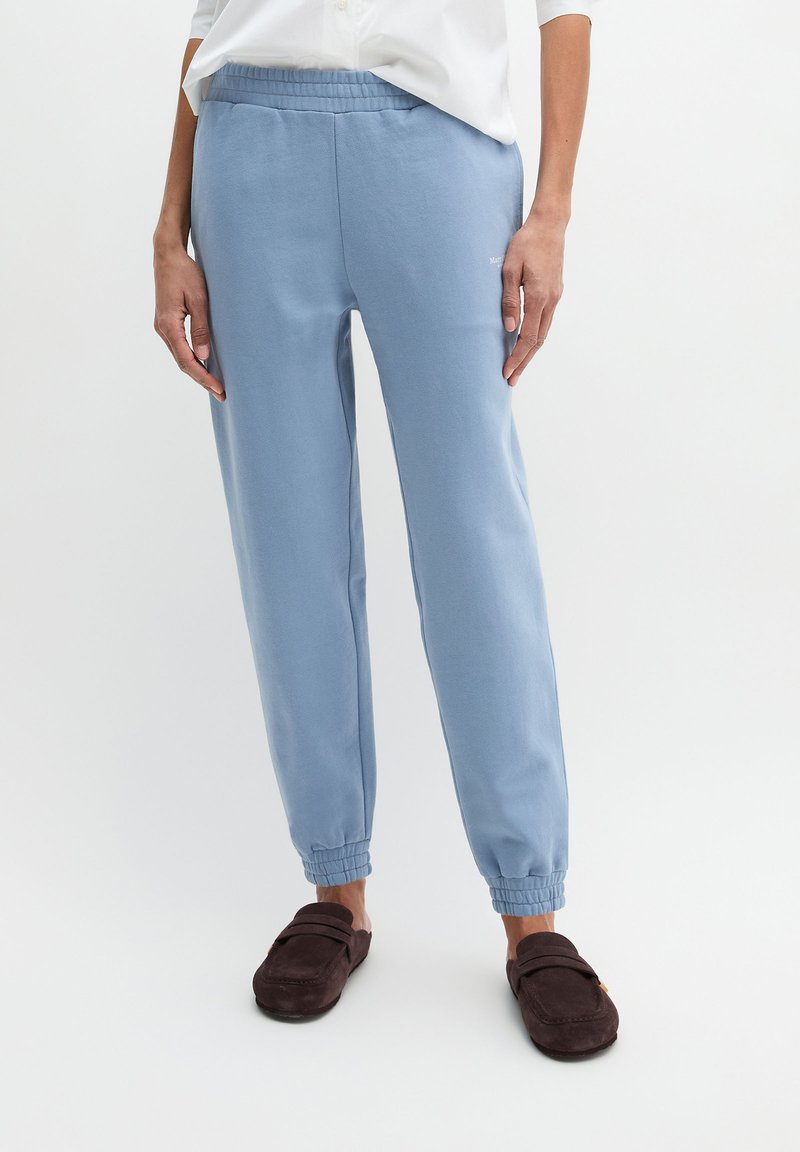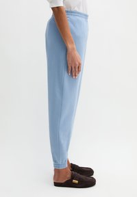 Osoba ubrana w jasnoniebieskie, elastyczne spodnie dresowe z paskiem w talii i ciemnobrązowe buty wsuwane, stojąca na tle białego, gładkiego tła.