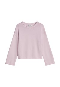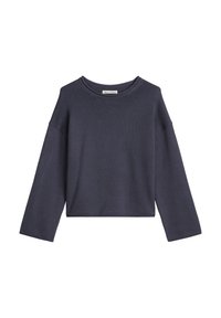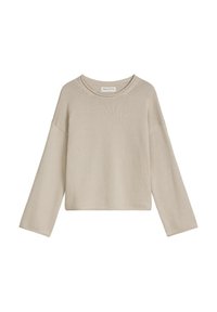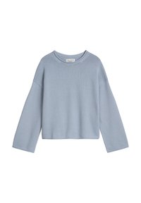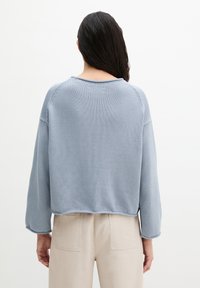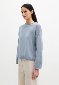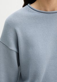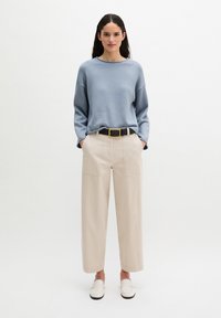 Jasnoniebieski sweter z dzianiny z szerokim dekoltem i luźnym krojem, zestawiony z beżowymi spodniami i czarnym paskiem z złotą klamrą.
