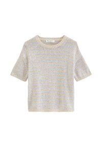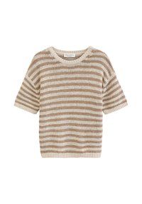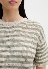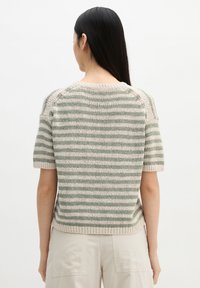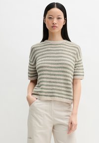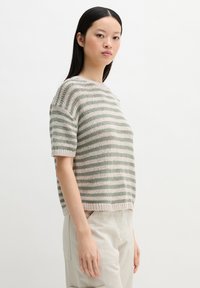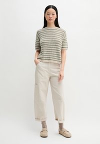 Kobieta o prostych czarnych włosach nosi zielono-beżowy sweter w paski z krótkim rękawem oraz beżowe spodnie, stoi z jedną ręką w kieszeni.