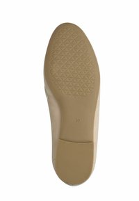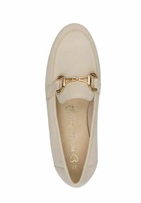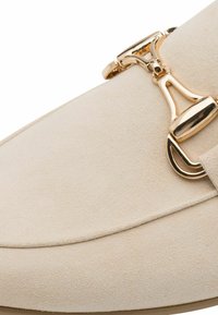 Beżowy zamszowy mokasyn na płaskiej podeszwie z ozdobą ze złotą klamrą, szpiczastym noskiem i niskim, drewnianym obcasem typu stack.