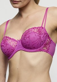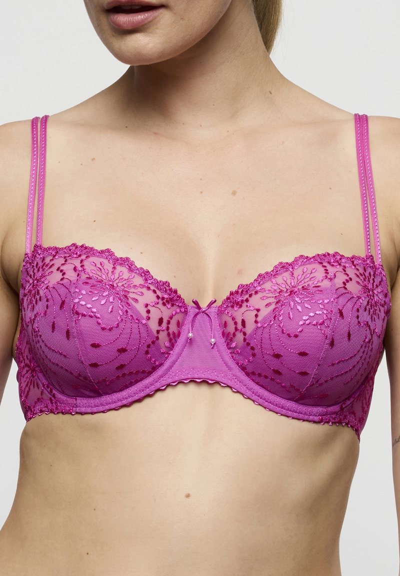 Różowy koronkowy biustonosz z półprzezroczystymi miseczkami, misternym haftem kwiatowym i regulowanymi ramiączkami. Posiada faliste krawędzie i ozdobne przeszycia.