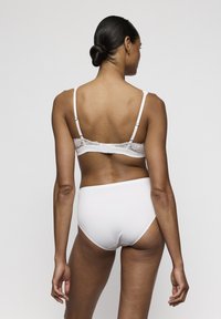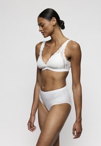 Kobieta o ciemnych włosach w białym koronkowym biustonoszu i białej bieliźnie z wysokim stanem stoi na tle jasnego, jednolitego tła, delikatnie się uśmiechając.