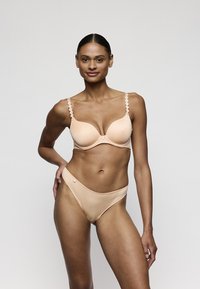 Zestaw bielizny w kolorze brzoskwiniowym, składający się z wyściełanego biustonosza z falistymi ramiączkami i miękkim, teksturowanym wykończeniem, uzupełnionego przez dopasowane, niskie figi.