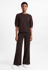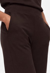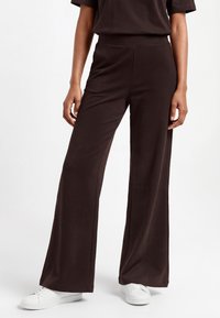 Kobieta ubrana w luźne, szerokie spodnie w ciemnym brązowym kolorze oraz białe trampki, stojąca na tle jednolitego jasnego tła.