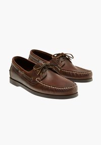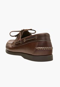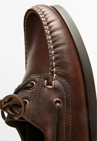 Brązowy mokasyn z miękkiej skóry z detalami sznurowania po bokach i na górze, płaska gumowa podeszwa i zszywany wzór na nosku.