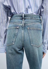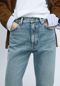 Zapięcie z przodu na zamek błyskawiczny i górny guzik. Szczegóły szlufki na pasek. Proste jeansy: prosty krój od talii do kostek, bez dodatkowych regulacji nogawek. Fason z pięcioma kieszeniami.