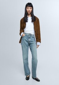 Osoba ubrana w jasnoniebieskie dżinsy z wysokim stanem i prostymi nogawkami, biały top, brązową kurtkę i czarne wsuwane buty, stojąca na jednolitym tle.