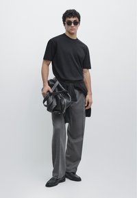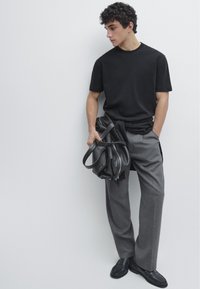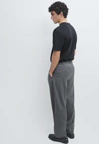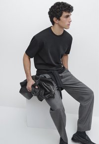 Młody mężczyzna o kręconych ciemnych włosach, ubrany w prostą czarną koszulkę z krótkim rękawem i szare spodnie, stojący na jasnoszarym tle.