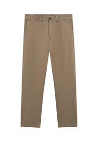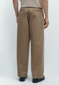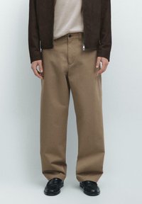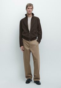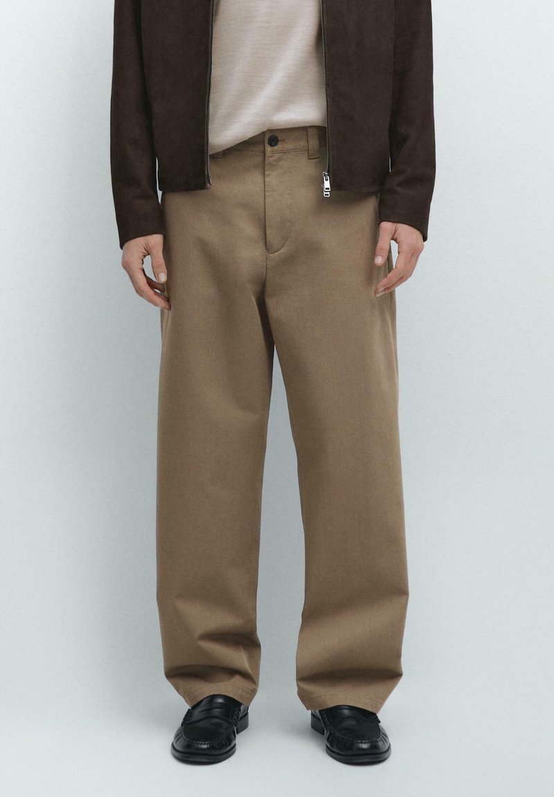 Brązowe bawełniane spodnie o luźnym kroju, z klasycznym wzorem pięciu kieszeni i zamkiem błyskawicznym z przodu. Zestawione z czarnymi mokasynami.