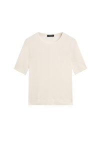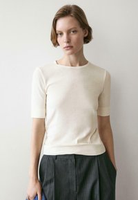 Kremowy, krótki rękaw, dzianinowy top z okrągłym dekoltem, prostym dołem i czarną metką marki przy kołnierzu.
