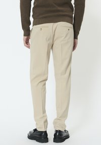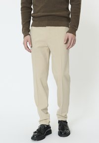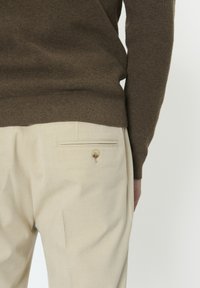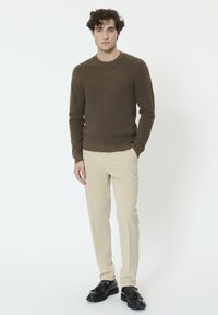 Mężczyzna ubrany w beżowe spodnie, czarne mokasyny z frędzlami oraz brązowy sweter z długim rękawem, stojący na jednolitym tle.
