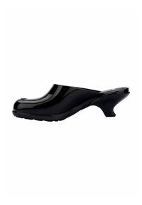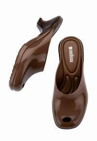 Brązowe plastykowe klapki typu mule z zaokrąglonym noskiem i niskim, zakrzywionym obcasem. Gładka, błyszcząca powierzchnia o prostym designie, bez widocznych wzorów czy elementów metalowych.