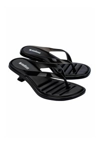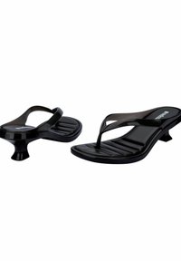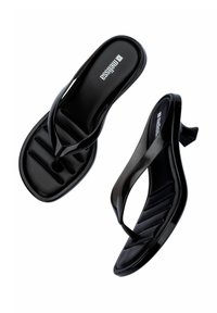 Czarna klapka na podwyższonej, zakrzywionej pięcie, z przezroczystym paskiem i teksturowaną wkładką. Smukły design podkreśla nowoczesną estetykę.