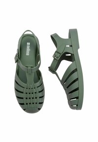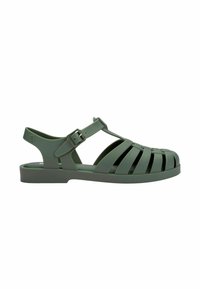 Zielony gumowy sandał z otwartym przodem, wyposażony w poziome i pionowe nacięcia dla wentylacji oraz regulowany pasek dla dopasowania.