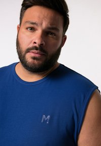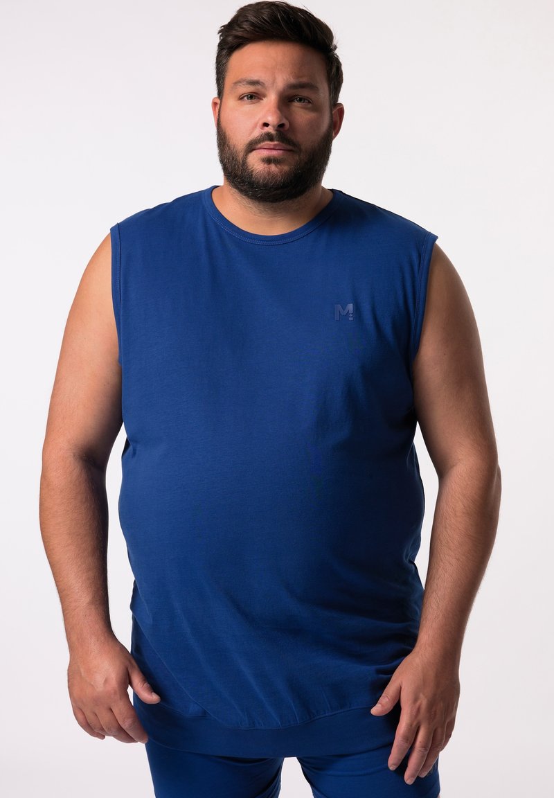 Bezrękawnik w kolorze niebieskim, wykonany z miękkiego materiału; wyposażony w okrągły dekolt i subtelne logo na lewej piersi; luźny krój z lekko zaokrąglonym hemem.