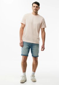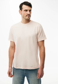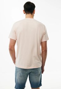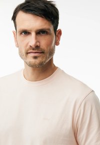 Mężczyzna o krótkich ciemnych włosach, ubrany w jasnoróżowy t-shirt z krótkim rękawem i niebieskie dżinsy, patrzący w prawo na białym tle.