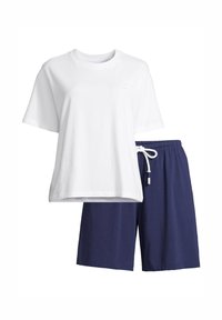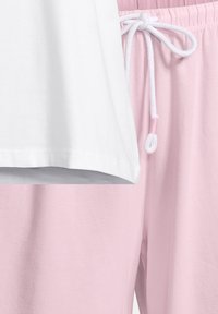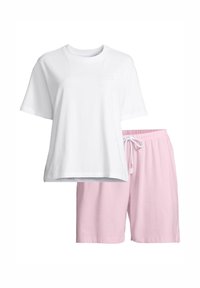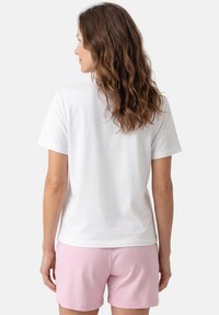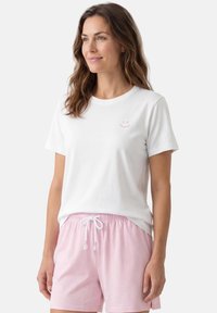 Kobieta o falowanych brązowych włosach, ubrana w biały t-shirt z małą różową buźką oraz jasnoróżowe szorty ze sznurkiem, lekko się uśmiechająca.