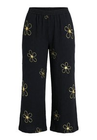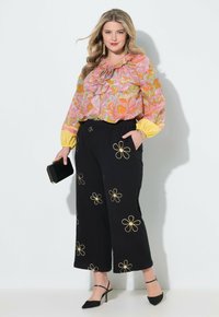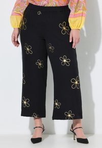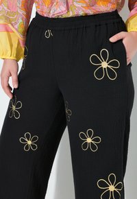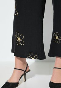 Czarne spodnie o szerokich nogawkach z haftowanymi złotymi kwiatami, noszone z czarnymi spiczastymi szpilkami i kolorową bluzką z długim rękawem.