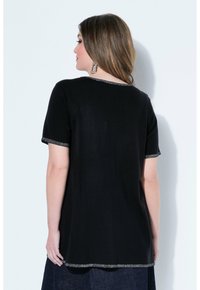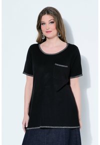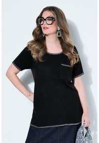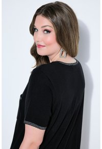 Kobieta o długich brązowych włosach nosi czarną krótką bluzkę z srebrną lamówką i kieszenią, w połączeniu z ciemną spódnicą dżinsową, stoi na tle białej ściany.