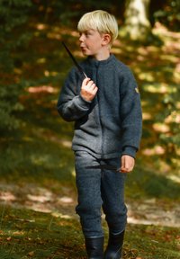 Szary wełniany rozpinany sweter i pasujące spodnie, teksturowana tkanina, noszone z wzorzystymi szaro-białymi skarpetkami, na tle drewnianej konstrukcji.