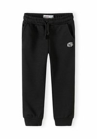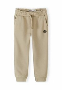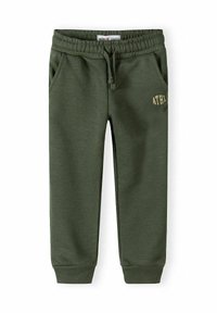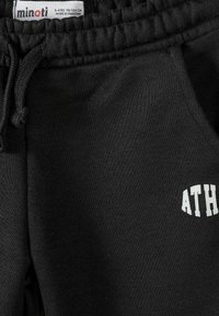 Trzy pary dziecięcych spodni dresowych w kolorach czarnym, zielonym i beżowym, każda z elastycznym pasem, bocznymi kieszeniami oraz napisem "ATHL" na udzie.
