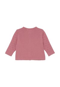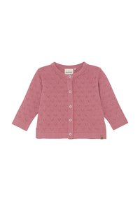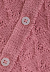 Różowy sweter na drutach z długimi rękawami, ozdobiony wzorem serca, z okrągłym dekoltem i zapinany na guziki z przodu. Wykończony małą metką na dole.