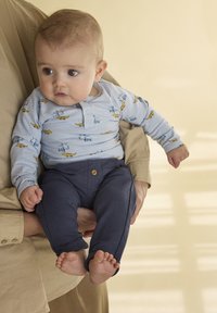 Jasnoniebieski body na długi rękaw z nadrukami zwierząt, w połączeniu z ciemnoniebieskimi spodniami z guzikiem. Miękka tekstura, dopasowany krój i podwinięte mankiety.