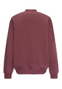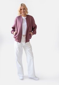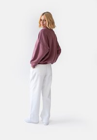 Bordowy sweatshirt na zamek błyskawiczny z opadającymi ramionami, w połączeniu z luźnymi białymi spodniami i białymi sneakersami. Miękka tkanina i swobodny krój.