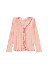 Różowy, dziergany dwuczęściowy zestaw składający się z karbowanego kardiganu, plisowanego topu oraz dopasowanych szortów z falistymi krawędziami, wszystko w fakturowanym wzorze.