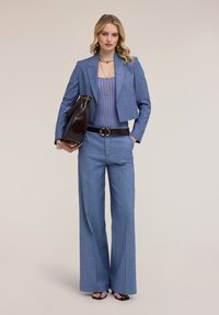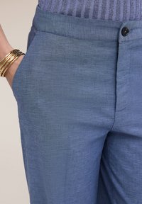 Kobieta nosząca wysokie, szerokie niebieskie spodnie z zapięciem na guziki, w połączeniu z czarnymi sandałami na otwartym palcu i złotymi bransoletkami na lewej ręce.