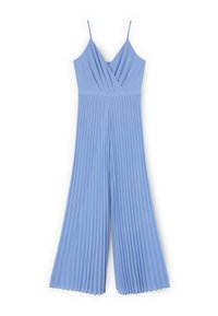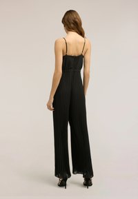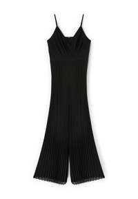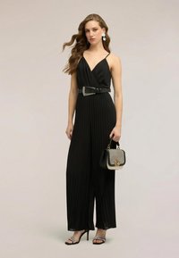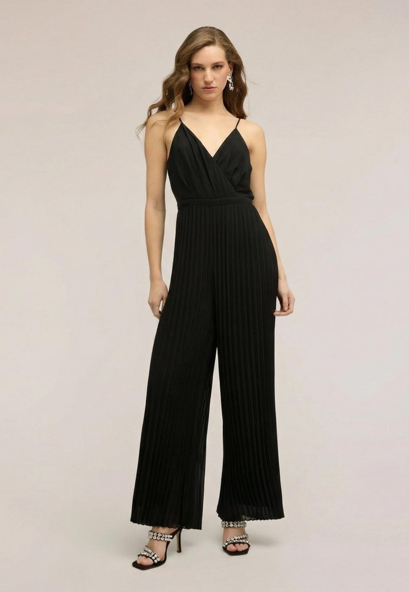Kobieta ubrana w czarny, plisowany kombinezon bez rękawów z szerokimi nogawkami oraz sandały na obcasie ozdobione kryształkami.