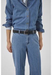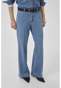 Osoba ubrana w jasnoniebieskie szerokie jeansy, czarny pasek oraz czarne spiczaste buty, stojąca z rękami luźno opuszczonymi wzdłuż ciała.