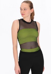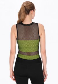 Kobieta ubrana w czarny bezrękawnik z siateczki na jaskrawoniebieskim sportowym staniku, w połączeniu z czarnymi legginsami z wysokim stanem, patrząca w bok.