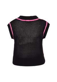 Czarna i różowa dziergana kamizelka z dekoltem w kształcie litery V, krótkimi rękawami oraz różnorodnymi wzorami tekstury; ściągacz na dole i kontrastujące kolorystycznie sekcje.