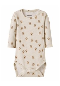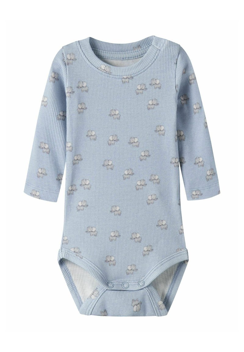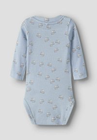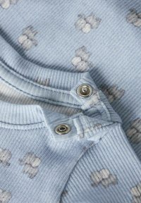 Jasnoniebieski prążkowany body niemowlęcy z długim rękawem, z małymi jasnymi wzorami chmurek i zatrzaskami w kroku.