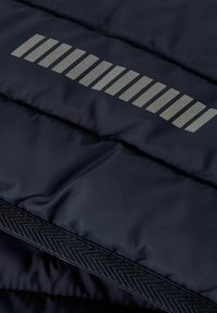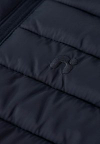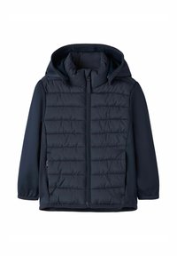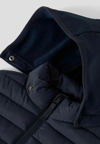 Granatowa kurtka z kapturem, pikowana z przodu, z pełnym zamkiem błyskawicznym i gładkimi rękawami, zaprojektowana dla ciepła i komfortu.