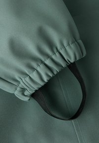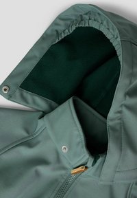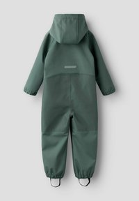 Zielony, wodoodporny jednoczęściowy kombinezon dziecięcy z kapturem, przednim zamkiem błyskawicznym, elastycznymi mankietami, wzmocnionymi kolanami i regulowanymi paskami na stopy.