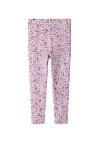Legginsy dziecięce w beżowej bazie z rozproszonym wzorem kwiatowym w odcieniach brązu, pomarańczu i szarości.
